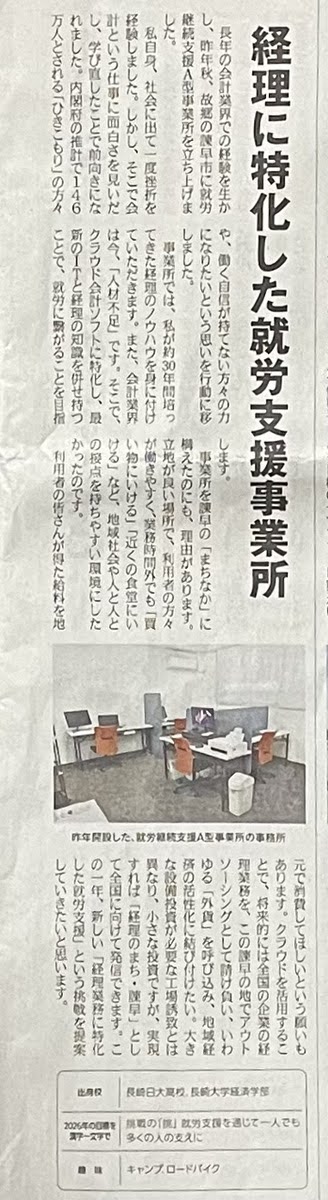 長崎新聞新年号に掲載されました! 2025年9月30日 最終更新日時 : 2026年1月9日 voice 『長崎新聞 新年号』に、当社社長インタビュー記事が掲載されました。 【経理に特化した就労支援事業所】